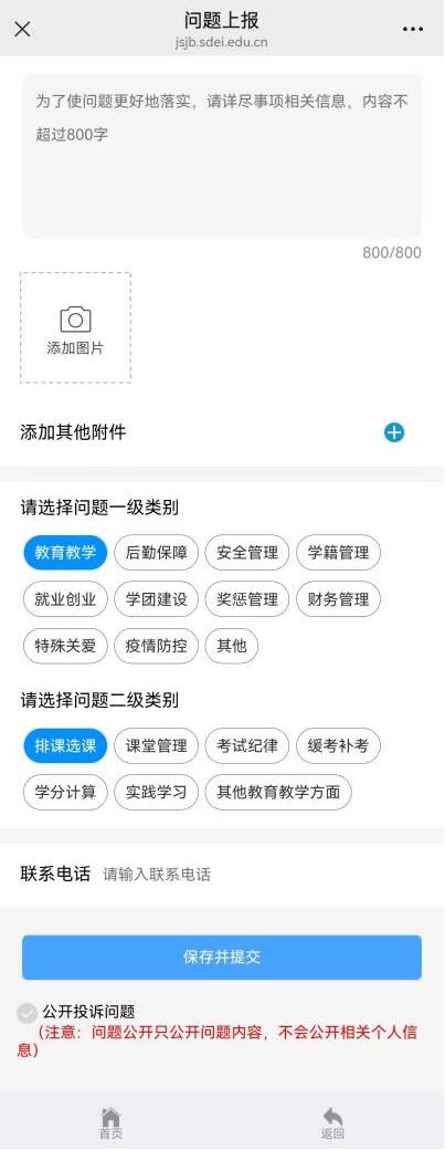 进入首页,点击【我要上报】,跳转至问题上报页面。填写反馈内容(可附图片)——选择问题的一级类别——选择问题的二级类别,即可进行提交。