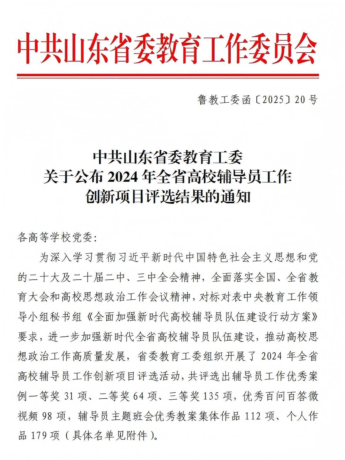 近日,中共山东省委教育工委公布了2024年全省高校辅导员工作创新项目获奖名单,本次活动共评选出辅导员工作优秀案例一等奖31项、二等奖64项、三等奖135项,优秀百问百答微视频98项,辅导员主题班会优秀教案集体作品112项、个人作品179项。学院报送的六件作品全部获奖,其中辅导员工作案例4项、优秀百问百答微视频1部、辅导员主题班会优秀教案1项。近年来,山东传媒职业学院坚持以习近平新时代中国特色社会主义思想为指导,落实立德树人根本任务,以打造“专业化、职业化、专家化”辅导员队伍为目标,系统推进制度建设、能力培养和激励机制,形成了具有“山传特色”的辅导员队伍建设路径。