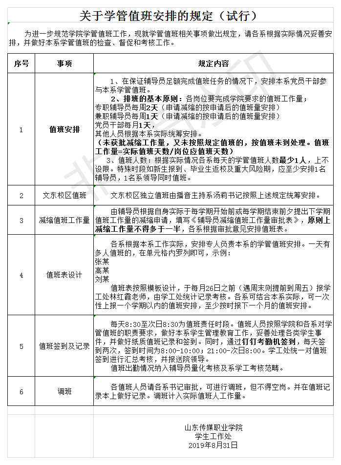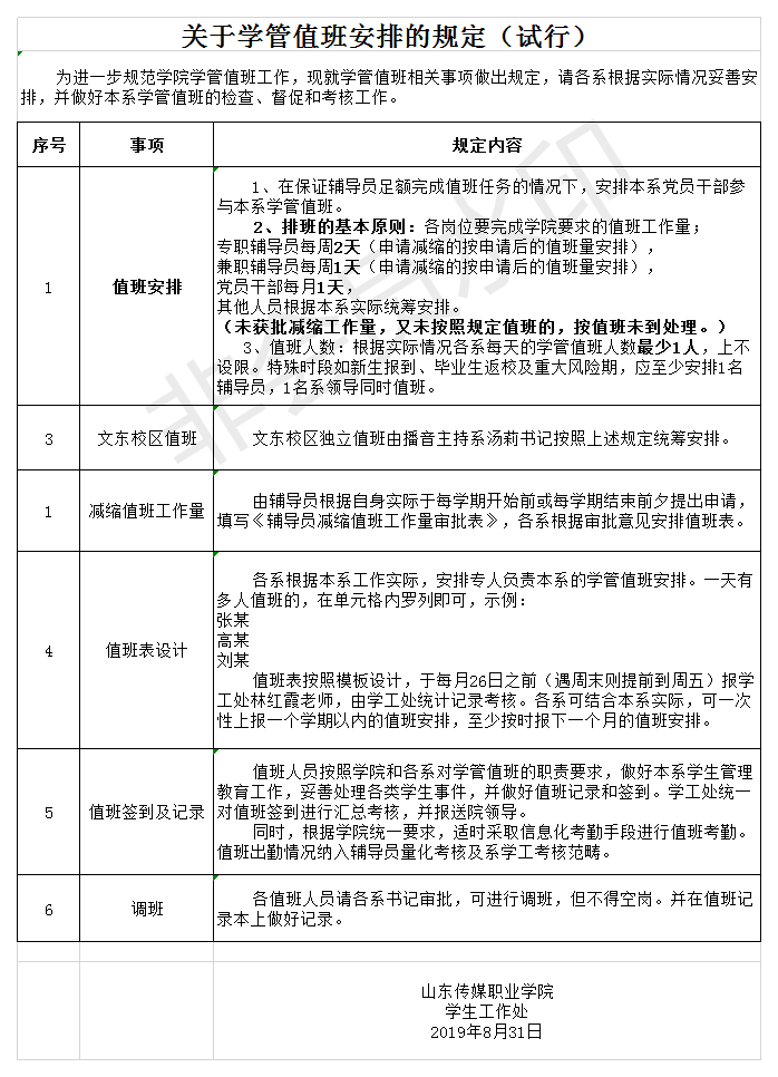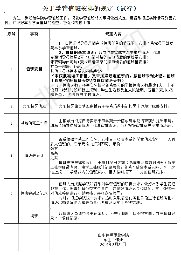 (五)值班人员经各系党支部副书记审批后,可进行调班。调班后,不能出现空岗,每系每天至少保证1人在岗。替班的计入实际值班人工作量。
