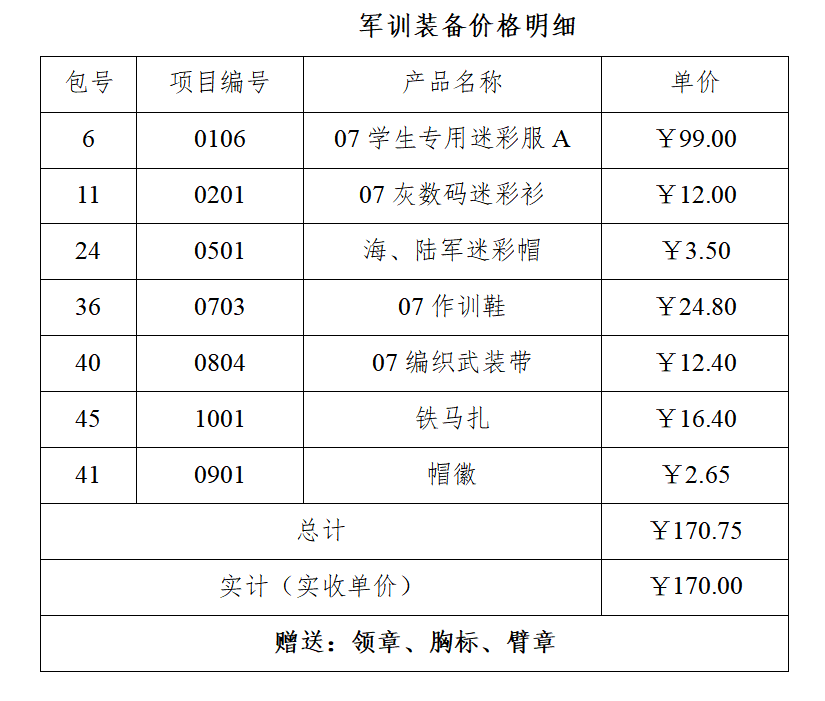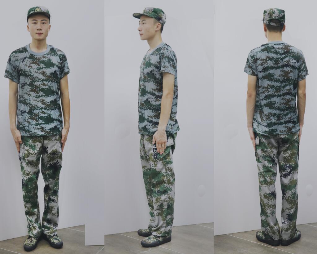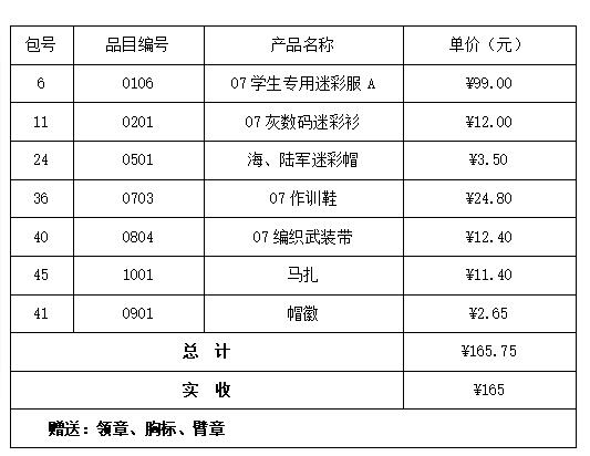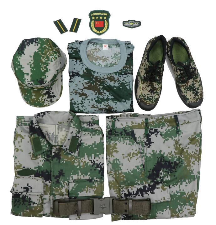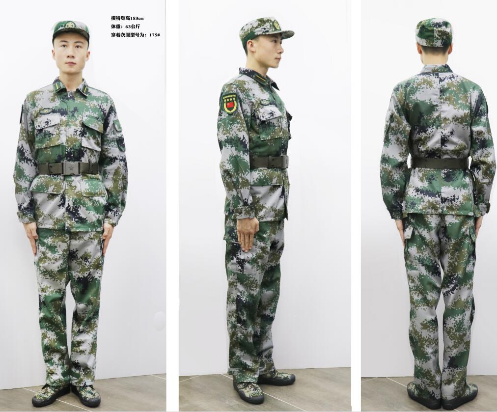 07式陆迷彩服,面料名称:混纺斜纹布,成份:60%聚酯纤维20%棉20%维纶。 产品内在及外观质量按GB/T23328-2009《机织学生服》标准合格品及以上要求,符合GB 18401-2010《国家纺织产品基本安全技术规范》B类规定。号型设置按 GB/T 1335.1~1335.3规定选用执行。 |