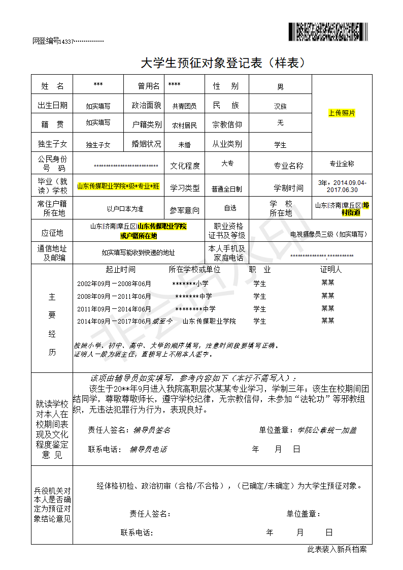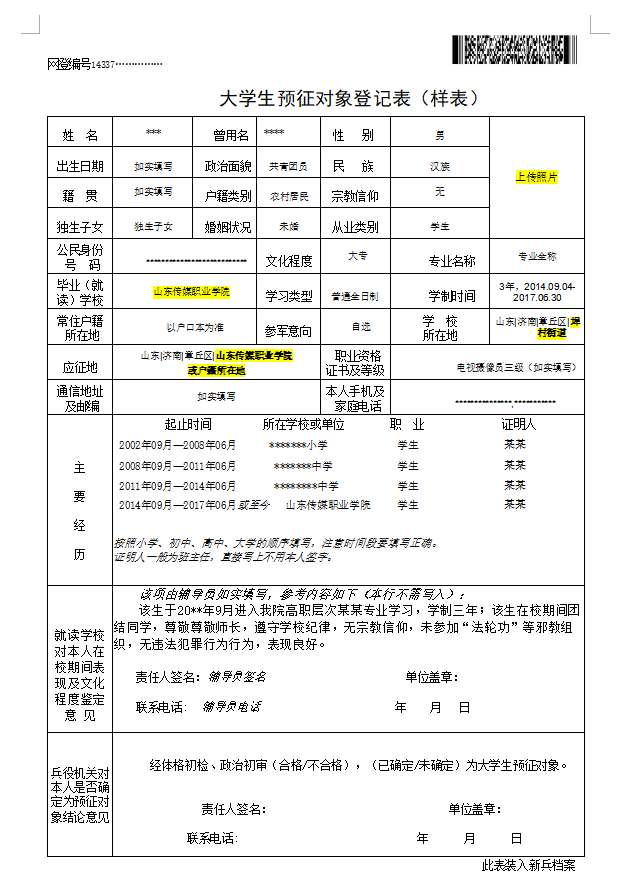 应征学生在登录全国征兵网填写应征报名信息时,按照该表对应的示例内容如实填写,以免出现不必要的错误。填写后,从全国征兵网下载后,得到该表,主要经历可复制本文附件内容,根据实际情况修改后,可生成打印版信息。