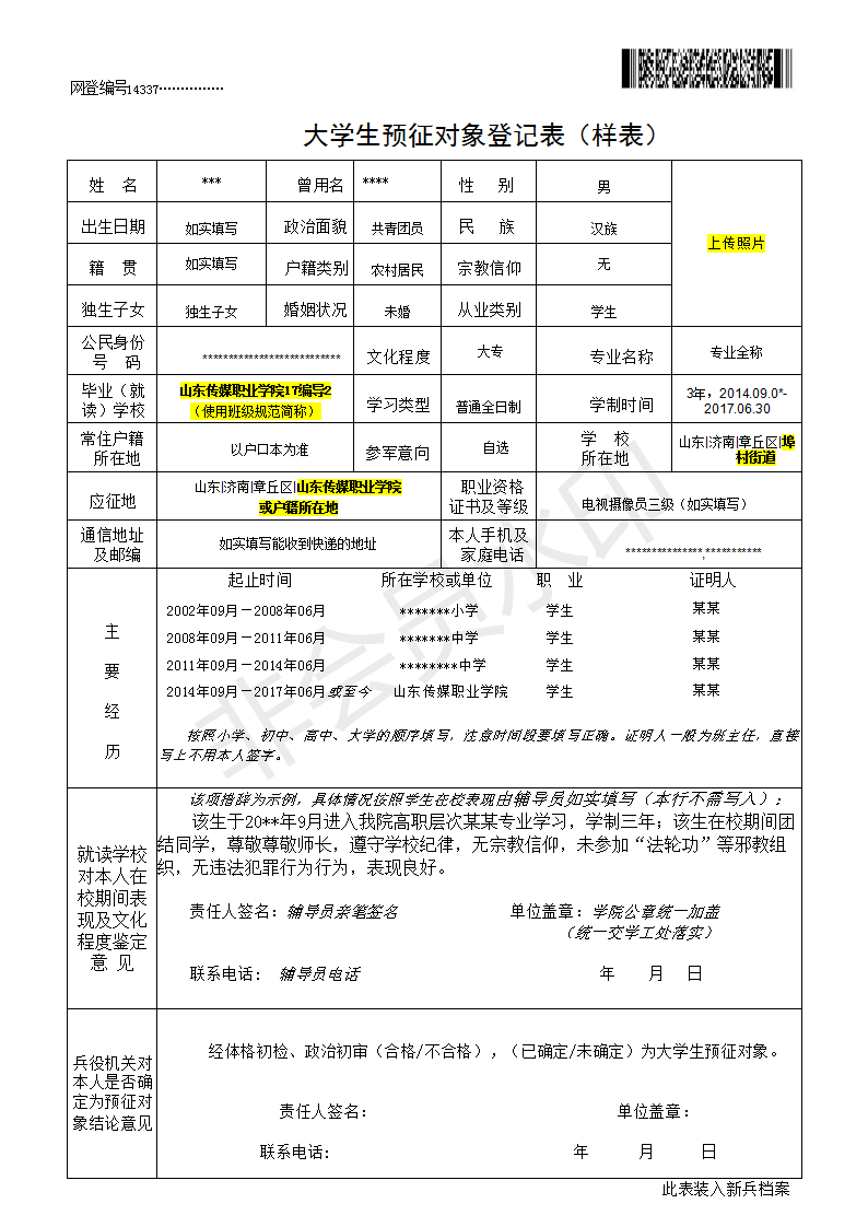 1、学生填写“主要经历”原则上应电子版填写,不建议手写。其他信息参照样表在“全国征兵网”填写;